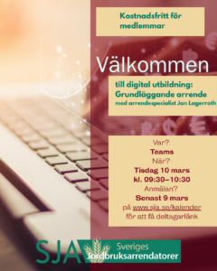 Sveriges Jordbruksarrendatorer (SJA) välkomnar dig till en digital utbildning i grundläggande arrendekunskap. Utbildningen leds av SJA:s arrendespecialist Jan Lagerroth och vänder sig till dig som vill stärka dina kunskaper om arrende och känna dig tryggare i din roll som arrendator.